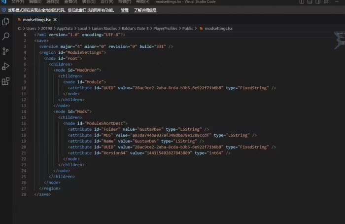 激活模组文件则需要改写PlayerProfilesPublic路径下的modsettings.lsx文件。打开该文件会发现其中已经激活了一个名为GustavDev的模组,(EA下为Gustav)这个是Swen的狗子,这个是正式版故事线的重要组件,它也是作为Mod挂载上去的,可见BG3的模组性相当好。仿造GustavDev的激活格式,逐步添加你所需激活模组的条目。至此模组正式安装完毕,modsettings.lsx作为游戏对模组的开启验证,会导致成就系统锁定。(在游戏存档中会有模组修改的标记)