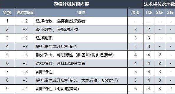 Lv1最大生命值:10+体质修正值;高级最大生命值:6+体质修正值,游侠法术为恒定预备,但低等级时可学习的法术数量较少,装备熟练项:简易武器、军用武器、轻甲、中甲、盾牌,豁免检定熟练项:力量、敏捷。