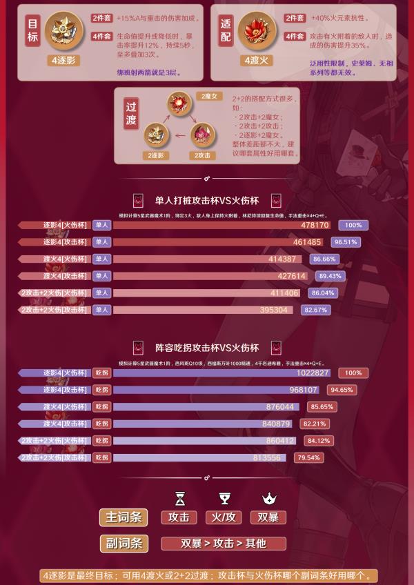 上图推荐了3种圣遗物套装搭配,最终目标是逐影4件套,如有成型的渡火4件套可以先过渡,或者直接选择2+2的搭配方式过渡。