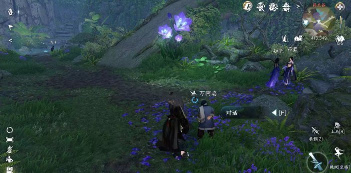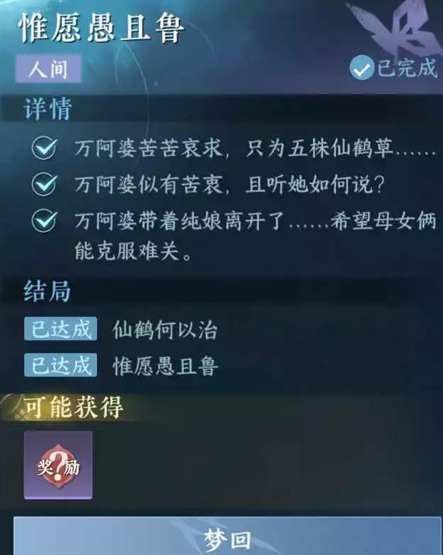 3、对话选择“继续询问”,对应结局“惟愿愚且鲁”,之后到药王谷413.349处找“万阿婆”对话即可完成任务
