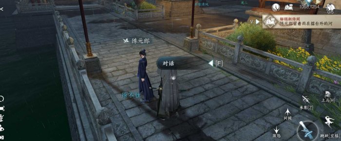 1、下雨天!到汴京1068.1254处与NPC“陈元郎”对话