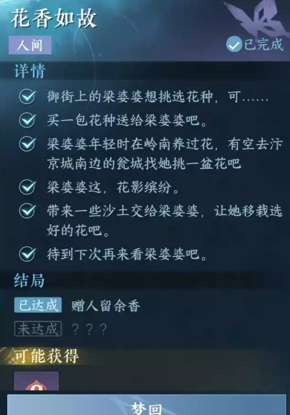 注:本人间任务有2个结局,可在本区域的人间任务列表进行梦回