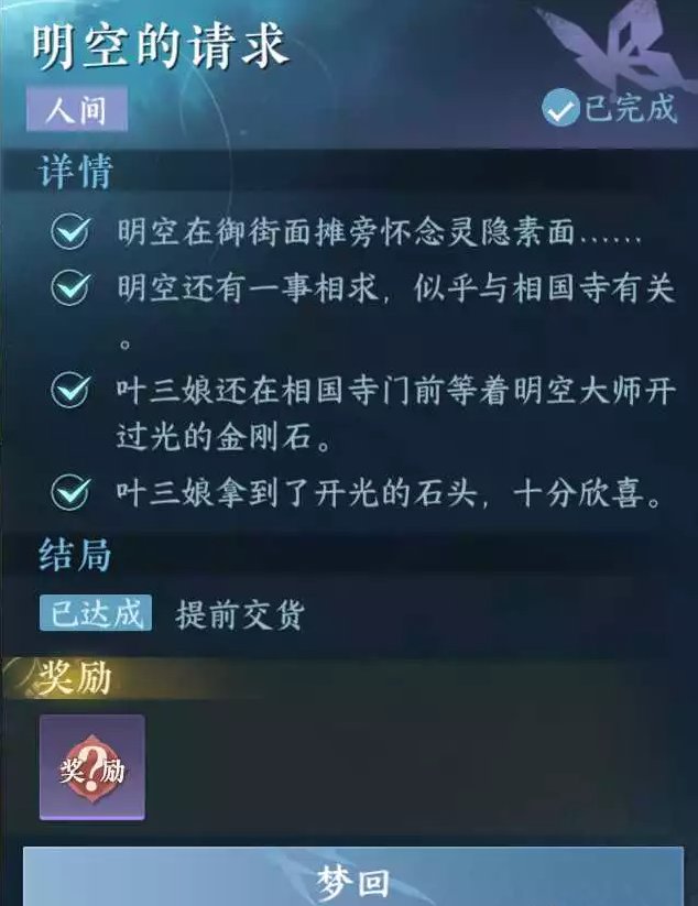 1、到汴京936.1128处向NPC“明空”提交“灵隐素面·良”并对话,获得“金刚石”