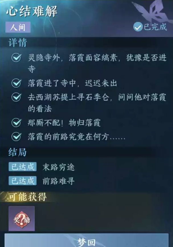 4、选择“谨慎考虑”对应结局“前路难寻”,之后到杭州877.1091处对话NPC“石季仑”,最后回到杭州724.1348处交“同心镯”交还给“落霞”即可完成任务