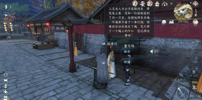 对话选择“鲁家小厮”,提交“皋月洗面药”(可以在杂货铺购买),获得“红绳”,之后到汴京813.1242处向“陆景行”提交“红绳”并对话即可完成任务