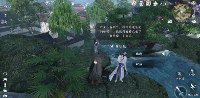 ③到杭州1348.872处向NPC“萧明鹤”提交“文房四宝”并对话