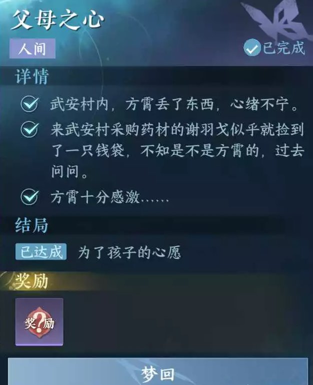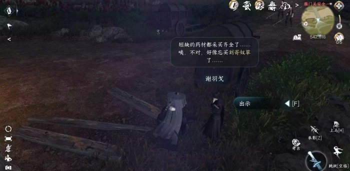 ②到雁门关542.816处向“谢羽戈”提交“刘寄奴草”,获得“钱袋”并触发本任务传闻