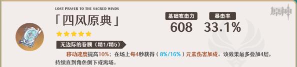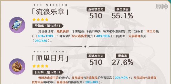 ①.流浪乐章:可以利用3种增益效果中的2种,当具有较高精炼等级、无上述5星武器时可以直接使用。该武器依靠着优秀的面板和高额的效果加成使得其仍然是法器角色的优先考虑武器之一。