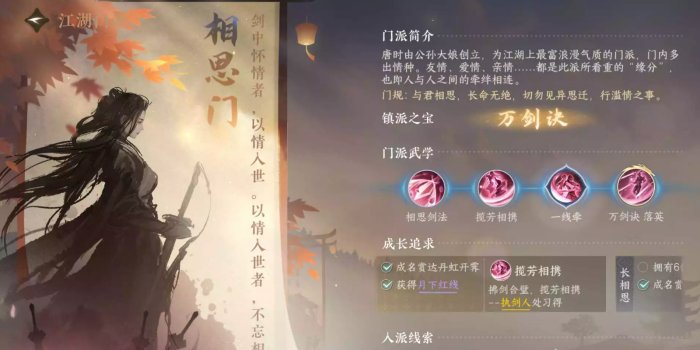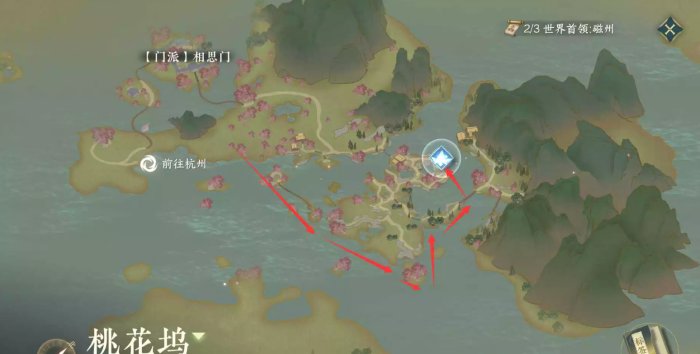 2、之后推进剧情,到去桃花坞那段,首先先点开江湖门派—相思门—执剑人传送到桃花坞,然后按我的路线图走水路滑行或者慢游过去,全程无任何遣返,也可以看其他人的教学走山路等等