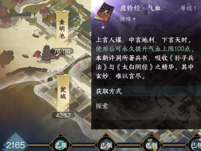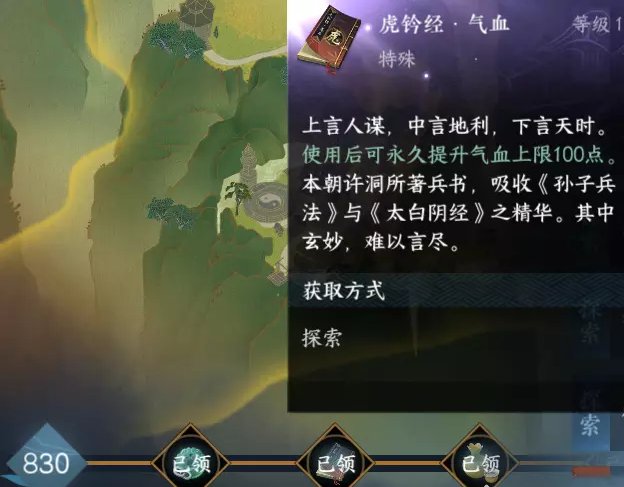 第一个:三清山探索点达到175点后解锁虎铃经·气血