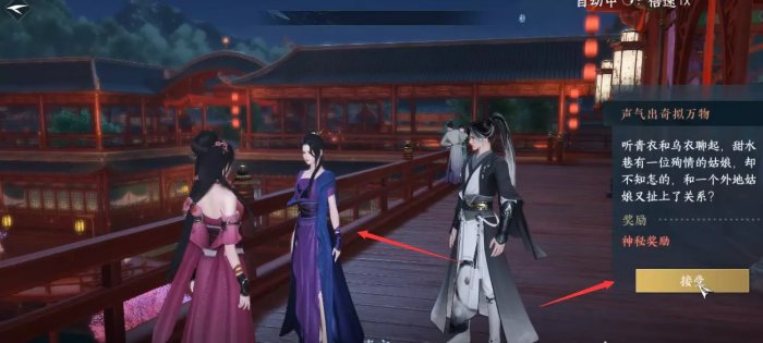 然后在靠近青衣对话,屏幕右边会出现声气出奇拟万物的面板,点击接受即可继续开启奇遇!