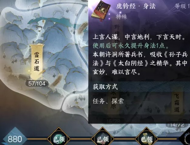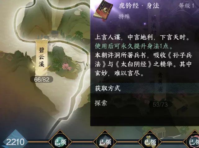 第二个:桃溪村探索点达到380点后解锁虎铃经·身法