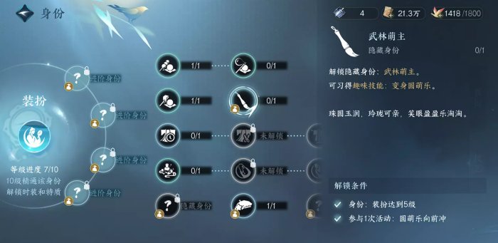 在背包使用变身盲盒即可获得一个圆萌乐形象,然后打开【身份】-【装备】-【技艺】,找到隐藏身份【武林萌主】,选择升级(需要装扮达到5级)