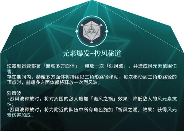 【烈风波】的增伤是全程覆盖的,而减抗需要怪物在影响范围内才能触发。「赫耀多方面体」是固定的移动路线,3秒走完一个三角形,并不会跟随怪物的位置改变,没有6命的「珐露珊」会出现减抗不稳定的问题。