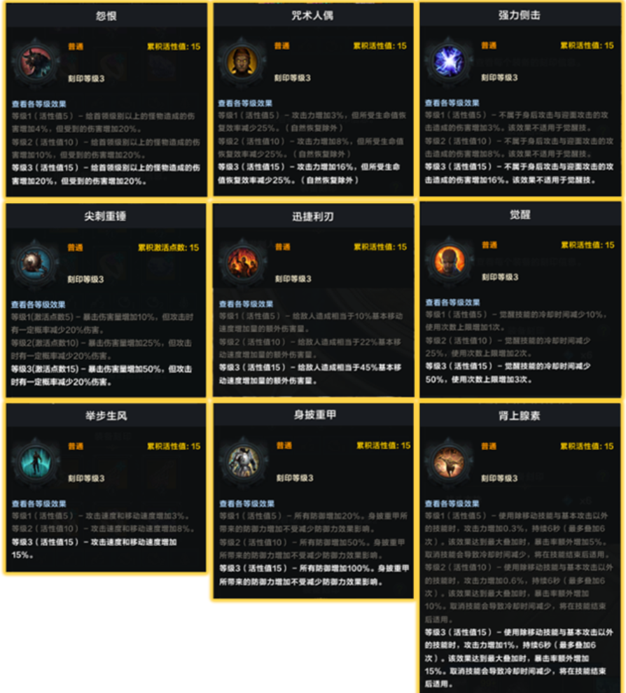 以上列举的仅为部分常用刻印展示,其他一些刻印仅对于部分职业或者部分情况下有用,这些就不展示了,例如先发制人,压制,奇袭大师,妙手回春,护盾猛攻,对决大师,破釜沉舟,精密短刃,蓄力强化,觉醒,速战速决,重量强化等。