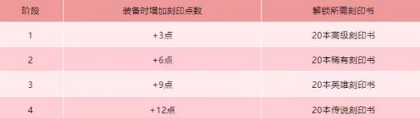 刻印本身也有4个阶段效果,装备不同阶段刻印时能提供的点数不同。使用刻印书可提升刻印效果的收集次数,每使用20本刻印书可以解锁下一阶段。已解锁的刻印可以在同一服务器中所有角色共同使用。目前游戏中已开放的刻印书获取途径包括:混沌地牢、深渊地牢、讨伐星辰护卫、魔方、高塔、任务奖励、交易行购买。