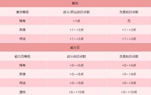 游戏中通过首饰,装备刻印,能力石来增加刻印点数,不同级别的装备提供的刻印点数不同,传说级别及以上品质首饰会有2个战斗刻印或一个战斗刻印一个职业刻印效果,所有级别能力石都可以提供2个战斗刻印效果。同时首饰和能力石还会附带负面刻印点数