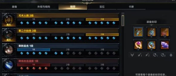 刻印可以为角色赋予额外的能力效果,能提供增益或减益,也可以改变职业技能的属性和效果。游戏中可以通过角色信息的刻印栏查看已经激活的刻印效果,鼠标左键点击刻印装备栏可以打开刻印效果栏(鼠标右键装备到第一个刻印栏,alt+鼠标右键装备到第二个刻印栏),同一刻印可以装备2个叠加累计点数。