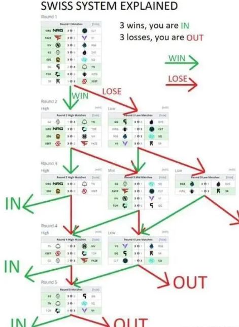 第三轮采取bo3的赛制,在第一轮和第二轮都获胜的四支队伍决出两个胜者晋级淘汰赛。