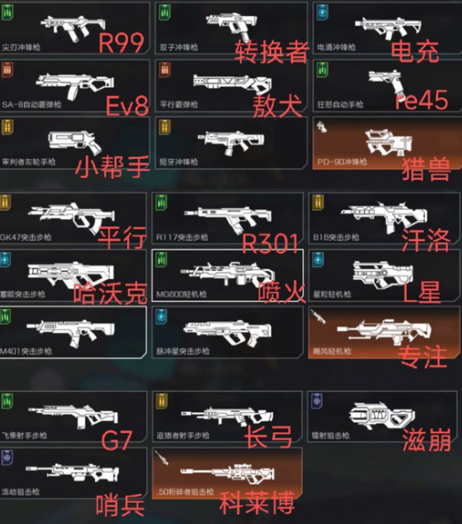 1.关于枪械,游戏目前的枪械可以分成好几大类,这几大类分别是手枪、霰弹枪、冲锋枪、突击步枪、轻机枪、神射手步枪和狙击步枪,这几类枪械在实战中的表现和用法都是不一样的。首先是近距离作战型的手枪、霰弹枪和冲锋枪类型的武器,这三种类型的武器分别有尖刃冲锋枪、双子冲锋枪、电涌冲锋枪、sa8霰弹枪、平行霰弹枪、狂怒自动手枪、p8r手炮、mm19冲锋枪和pd90冲锋枪。