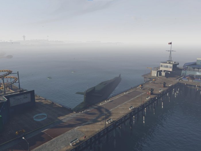 下面就可以开始前置任务了,首先我们先把虎鲸停靠在威斯普奇海滩的游乐场边上,紧贴着游乐场,这样我们通过差事传送能很轻松的翻阅护栏跳上去,不用再使用马克兔,小艇,麻雀等载具跑过去了。