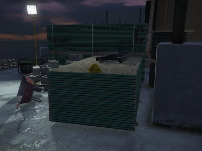 中型建筑工地的安全帽位于侧面的一个小房间,通过两块斜着的板子进入建筑工地,左面就可以看到安全帽。