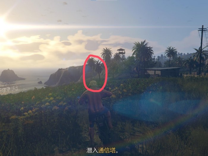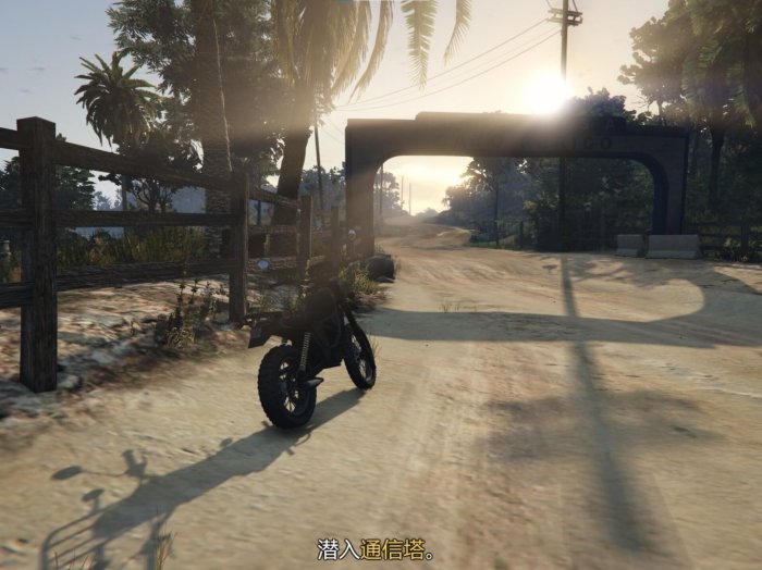 经过第一个哨点时,左面有一个斜坡,用摩托对准靠右侧的两棵树中间,加速可以直接冲过去,不会被发现,但是要注意塔上的敌人。
