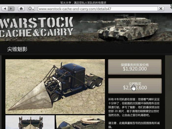 想要获取尖锥魅影,如果各位没有购入新手包,则需要购入一个办公室,并且解锁一个载具仓库,办公室最便宜的是花园银行西岸起购价1000000,然后需要再购买一个载具仓库,最便宜的是位于布罗高地的载具仓库,购买价格1635000,如果没有钱的小伙伴也可以不用购买,因为尖锥魅影只能让做长鳍任务的速度提升,其他的并没有什么用处。(在此任务中)