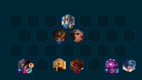 加里奥单顶第一排,皇子与乌鸦站第二排吃德玛bf。其余后排卡沉底,卡牌单独站左侧防皇子,琴女站另一侧角落,大眼站琴女临格吃攻速bf。