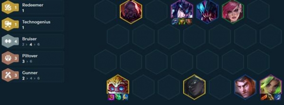 羁绊:4枪手、4格斗、3皮城、2祖安、1发明、1涤魂