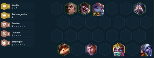 羁绊:5约德尔、1大发明家、2壁垒、2枪手、2战略家