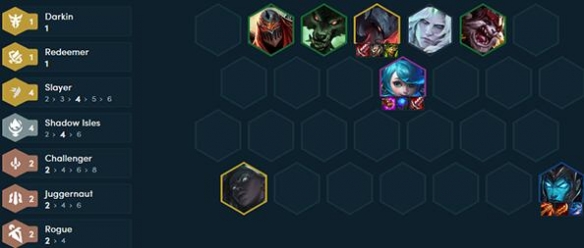 羁绊:4暗影岛、1暗裔、1涤魂圣枪、4杀手、2挑战、2战神、2潜行者