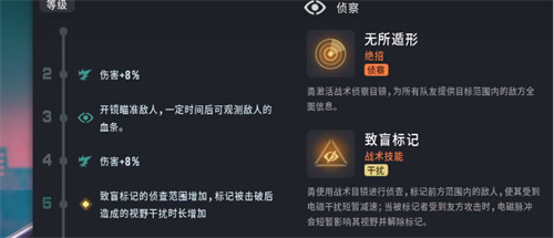 他的主要技能是干扰其他队员的侦查,并且还能解除标记。这个技能在某些情况下可以起到关键的作用。比如,当队伍被敌人发现时,他可以通过干扰敌人的侦查,为队伍争取更多的时间和机会进行撤退和重新部署。同时,他还能解除标记,让队伍更加难以被敌人发现,增加了作战的灵活性。