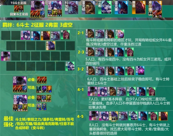7人口,更好基本阵容,血少7人口梭哈找二星尼莅,二星猪妹。血多7人口不停留直接存钱跳8人口,斗士转给寒冰先带。