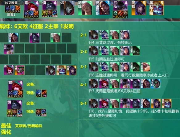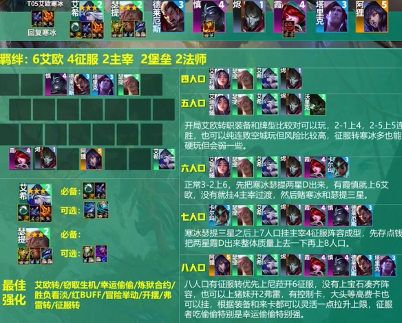 开局艾欧转职装备和牌型比较对可以玩,2-1上4, 2-5. 上5连胜,也可以纯连败空城玩但风险比较高,征服转寒冰多也能硬玩但会弱一-些。