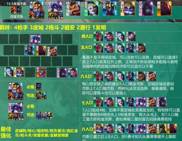 枪心祖安转之类的建议6人口赌金克斯,空城皮城或者胡杰斯上7人口赌杰斯,两种玩法灵活选择,装备通用,前排可以是格斗也可以是狼人。