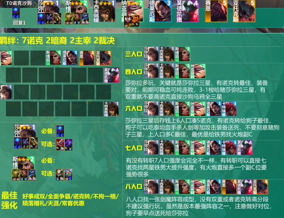 诺克找两星铁男大提升强度,有火炮直接多-一个副C位要强势很多八人口找一-张剑魔阵容成型,没有双重或者诺克转高分段不建议强行玩,虽然是版本最强阵容之- -, 注意做好对位,狗子要早点送死给莎弥拉。