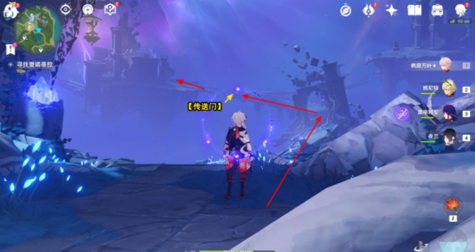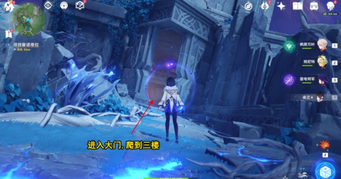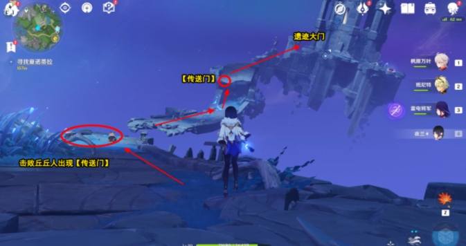 到达后,向北走,击败丘丘人后,出现【传送门】,利用路上的【传送门】,前往对面遗迹大门