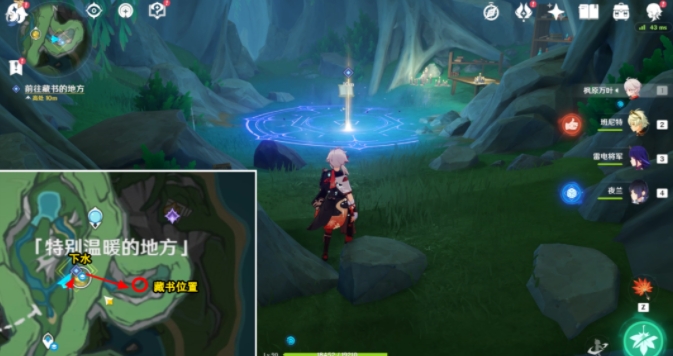 跟随指引下水,向东游,到达藏书位置