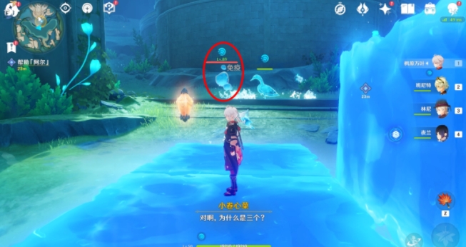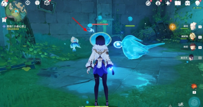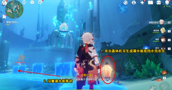 攻击晶体机关生成凝水板,抵挡水泡攻击,沿着凝水板移动到对面,别被水泡打到