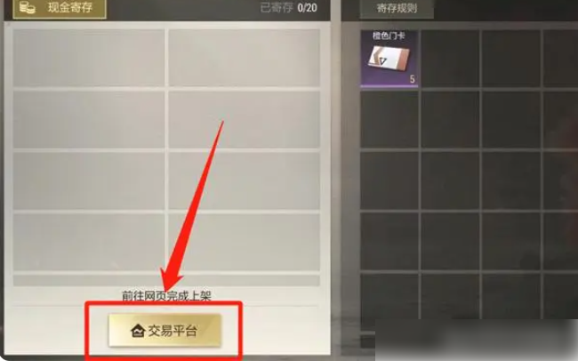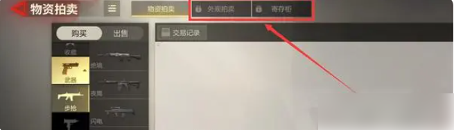 第二步:点击顶部导航栏选项进入寄存页。玩家需要根据要出售的物品类型选择,如果是皮肤一类的可以选择外观拍卖;如果是门卡、货币等道具类可以选择寄存柜。