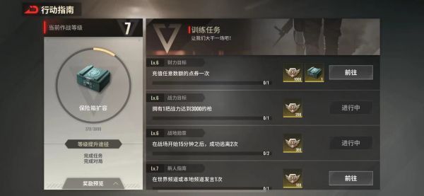 在游戏的主页面,有一个行动指南的图标,点击之后玩家就可以看到所有的奖励了,在玩家达到八级、三十级的时候分别可以获得一个保险箱扩容的位置。另外在玩家首次充值的时候也会获得一个保险箱扩容的位置。