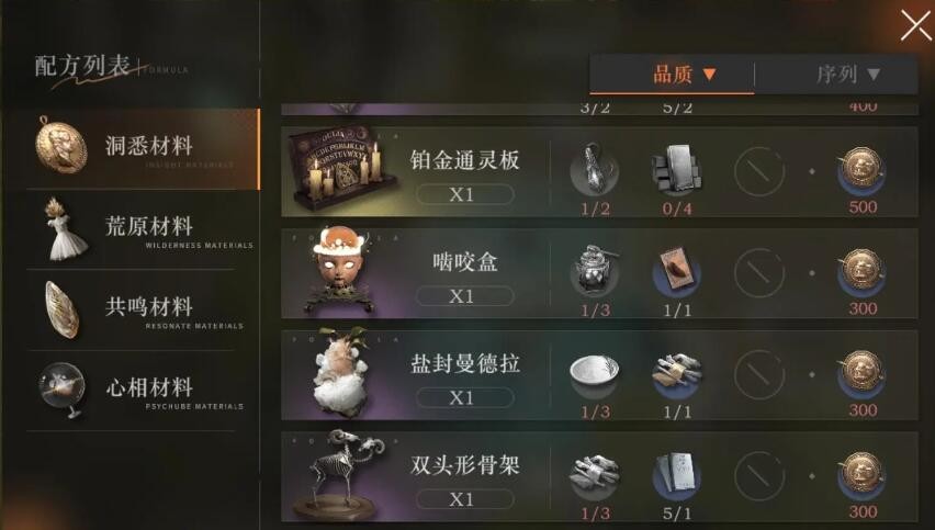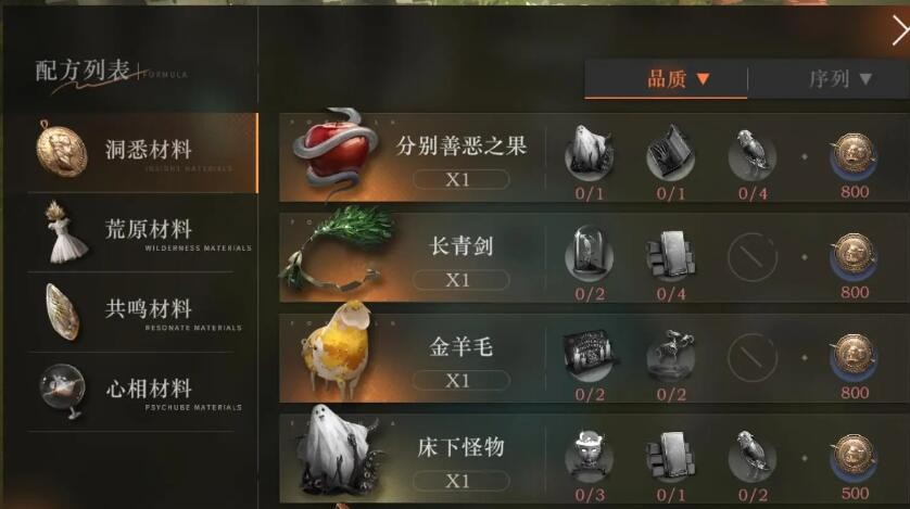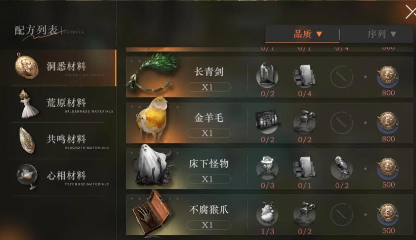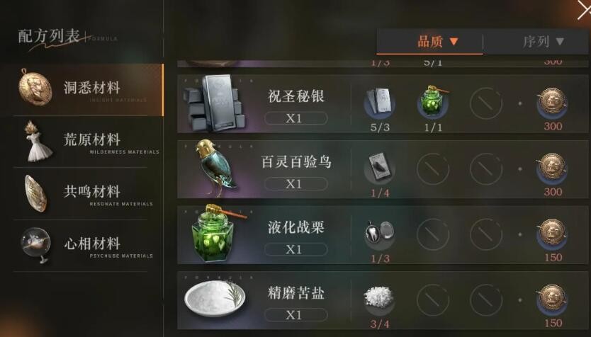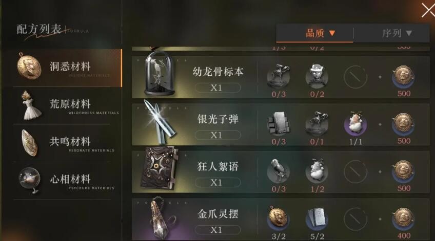 未知种根骨,罗马金币,粗糙银锭,液化战栗,幸运符语,精磨苦茶。这些材料都属于中级洞悉材料,它们的来源在迷途鉴定中,除了罗马金币在自然的夜面无法获取之外,其他的都可以在这里获取到。