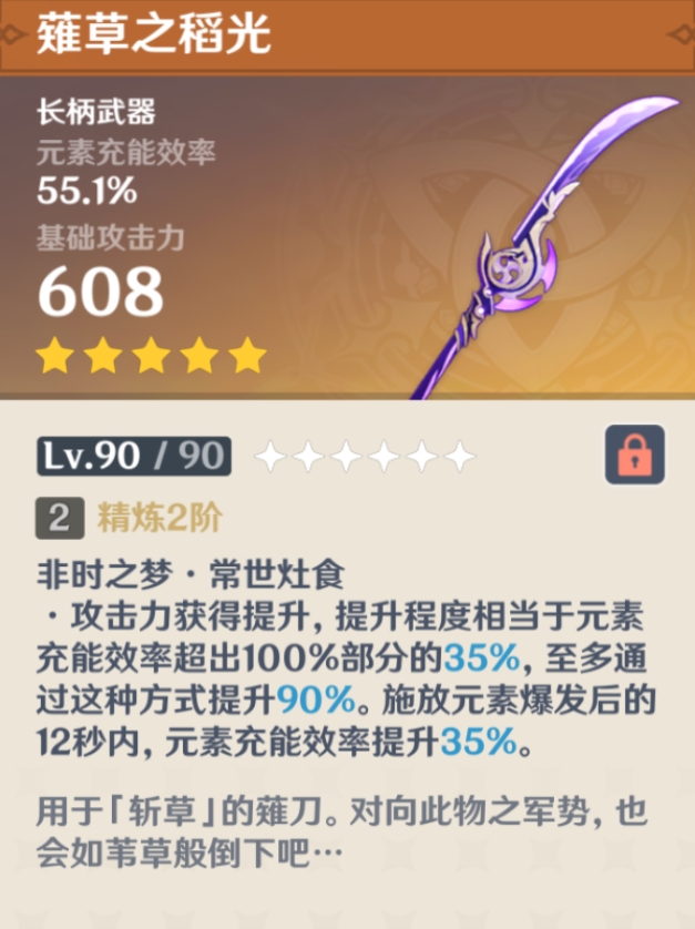 然后是薙刀,也是雷电将军的专武,副词条和武器特效都提供了大量的元素充能和攻击力加成。相比护摩,薙刀的强度是建立在元素充能上的,充能越高,提升的攻击力就越多,所以很多依赖大招和充能的枪系角色都可以佩戴它。