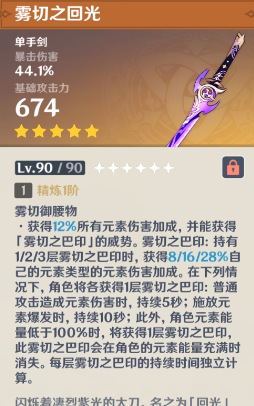 这也是目前公认的单手剑强度第一名。满级可以提供674点攻击和44.1%的暴伤,属性方面非常够用且实用。但最离谱的还是武器被动,即使是精一的状态下,叠满三层雾切之巴印后,也可以获得高达40%的元素伤害提升。虽然是绫华的专武,但泛用性却极高,大部分单手剑的主c副c都能用。