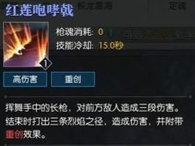 第一套最基本的连招:凌云跃->烈焰枪->红莲咆哮戟;第二套连招方式:轻功突进->挑->烈焰枪->红莲咆哮戟;第三套连招方式:利用扫加追造成一段位移,吸过来然后接挑->烈焰枪->红莲咆哮戟。