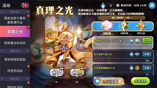 《冲呀饼干人王国》玩家在进行真理之光的时候需要挑战混沌蛋糕塔和探索地图。《冲呀饼干人王国》是一款受到了很多玩家欢迎和喜爱的冒险战斗类游戏。玩家可以在游戏中获得很多技能不同的饼干人,游戏内还有大量关卡等待玩家去挑战,成功通关之后能够获得大量的系统奖励。很多玩家对于游戏内的真理之光很感兴趣,接下来B游就给大家带来《冲呀饼干人王国》当中真理之光的攻略介绍,让我们一起来了解一下吧。