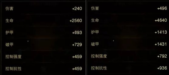 刚刚说完小宝石就不得不提到赫拉迪姆遗志,左图是192级的赫拉迪姆遗志,右图是大佬374级,很明显加成属性天上地下,光是破护就拉开了一半多。所以想要一步到位一定要关注一下赫拉迪姆遗志等级,这个属性很难提升,主要是氪金才能追上的。