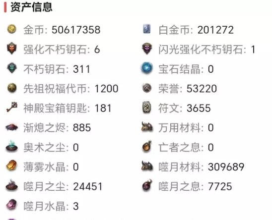 像这个号白金币20W,荣誉币5W,噬月材料30W(如果开放30~40级强化,估计能直接拉到全身强化35级),渐熄之烬885(等于将近3个闪光强化不朽钥匙),还有仓库的绿装储备等等,这些东西大家都不要忽略了,如果价格实惠没有也行,如果有就非常爽了。
