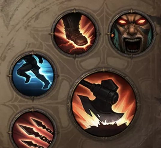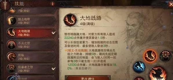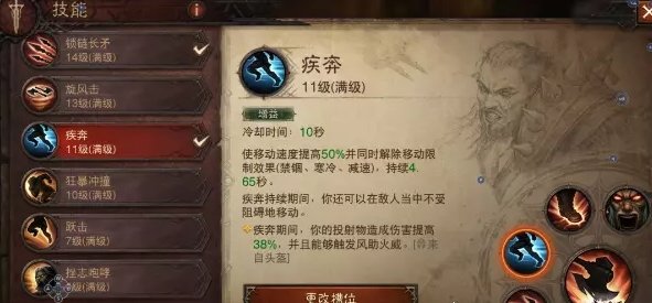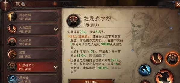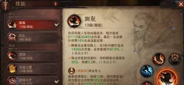 普攻选择了撕裂,因为副手选择增加2根长矛并且破碎的传承不能动,所以带狂乱会少一个关键叠伤害精华,故而放弃。主手带撕裂重创敌人,并且受伤叠攻速,搭配刚刚提到的护肩我们只要攻击就能叠到攻速,完全不用担心要被动受伤才能叠伤害。